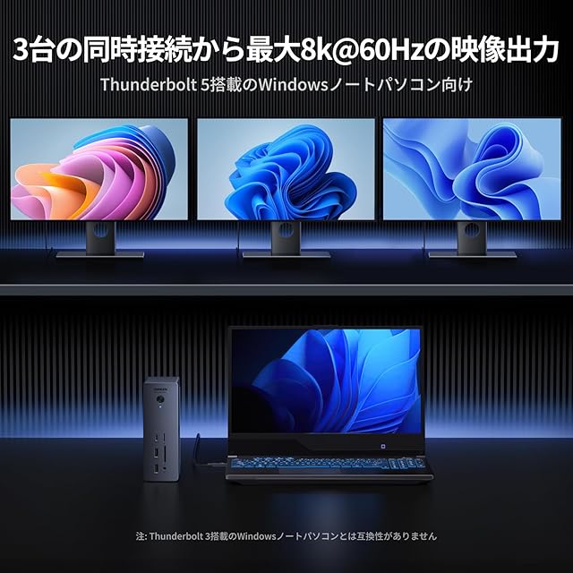 【驚異的互換性!Thunderbolt 5/4 & USB-C 対応】Thunderbolt 5 ドックは、Macbook (macOS 15.0 以降)、Windows ラップトップ (Windows 11 以降)、iPad、またはその他のタブレットを含む、ほとんどの Thunderbolt 5、Thunderbolt 4、USB-C、またはコンピューターまたはタブレットと互換性があります。 USB-Cポート付き。 (一部のThunderbolt 5 Windowsラップトップは3画面ディスプレイをサポートできます)