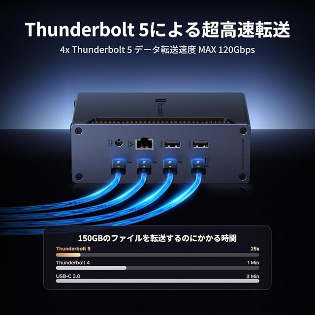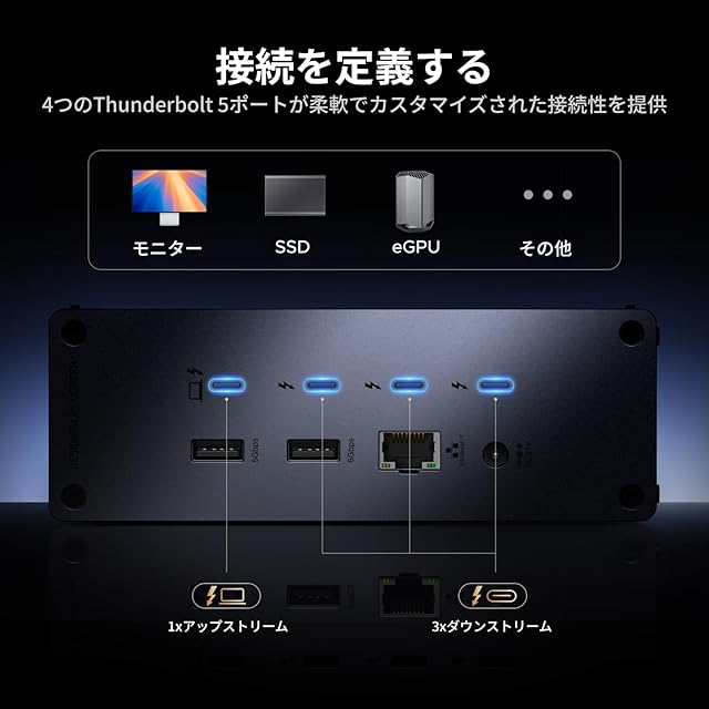 【2025最新傑作!Revodok Max 13-in-1拡張】24ヶ月品質で、12時間以内に対応しますので、安心してご購入ください!Thunderbolt 5 ドッキングステーションには、Thunderboltユーザー向けに設計、4 つのThunderbolt 5(最大120Gbps、単一画面出力8K@60H、6K@60Hのデュアルスクリーン出力)、1 つのUSB-C 3.2 (最大10Gbps、20W)、 2 つのUSB-A 3.2(最大10Gbps) 、 2つのUSB-A 3.0(最大5Gbps)、1 つの SD/TF4.0カードスロット(最大312MB/s) RJ-45イーサネット(最大2.5Gbps)、オーディオ(3.5mm AUX)および 180W DC 電源ポートを備えており、すべての高性能拡張ニーズを満たすことができます。さらに、洗練されたケーブル管理システムにより、デスク周りの配線を整理し、快適で効率的な作業空間を提供します。