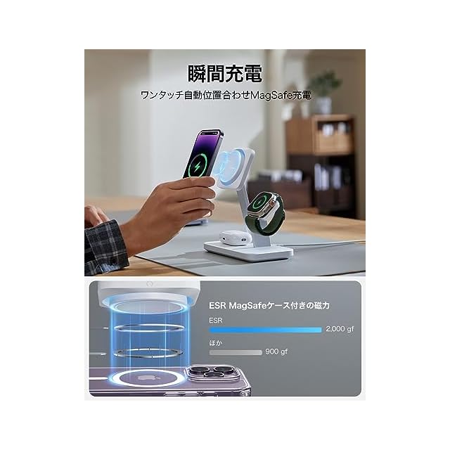 商品名:ESR 25W 3in1 MagSafe充電器 Apple認定磁気ワイヤレス充電器 CryoBoost冷却ファン付き 充電スタンド iPhone 16/15/14/13/12/Apple Watch/AirPods 4/3/AirPods Pro用 高速MagSafe充電ステーション スマホ冷却充電器 ホワイト