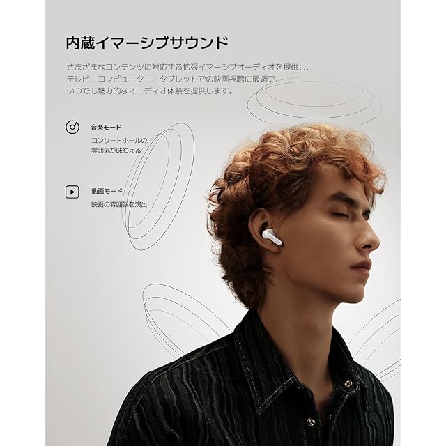 【没入感あふれるイマーシブサウンドモード】イマーシブ・オーディオを内蔵し、SBC、AAC、LC3、LDACのオーディオコーデックをサポートしています。標準モードに加え、ミュージックモードとムービーモードが新たに搭載され、没入感溢れるサウンド効果をもたらし、テレビ、コンピューター、タブレットでの映画視聴に最適で、いつでも魅力的なオーディオ体験を提供します。