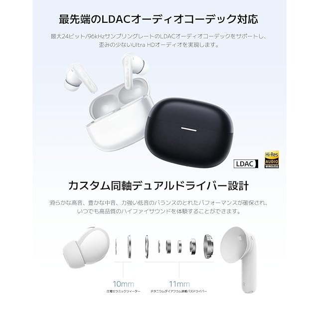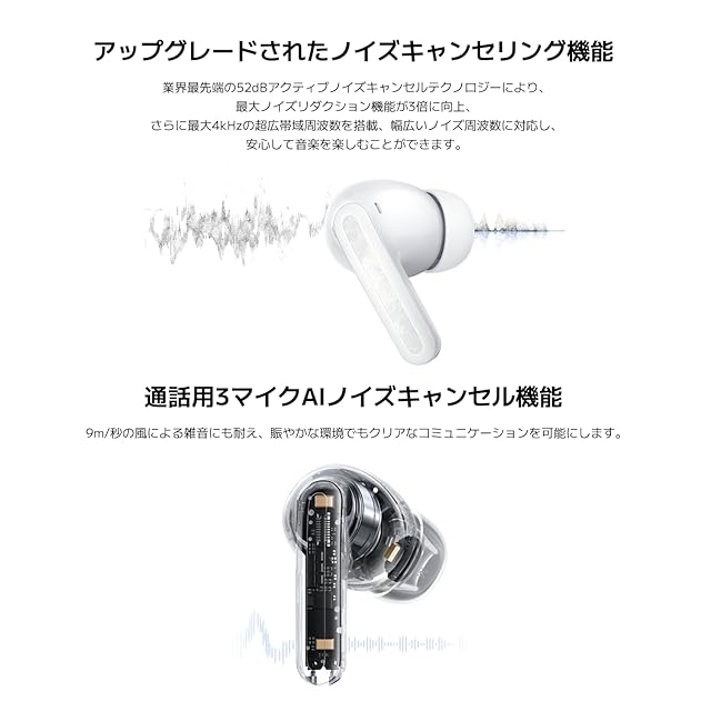 【パーソナライズされたスマートノイズキャンセリング】最大52dB/4kHzの高性能ハイブリッドANCと3MIC+AI通話ノイズリダクションを搭載。前モデルに比べANCは30%向上しています。また、パーソナライズドANCで耳とイヤホンの装着方法を分析し、最適なANCプロファイルの作成が可能です。さらに、カスタマイズされたEQモードは、ユーザーが最も好きな音響環境をかなえます。