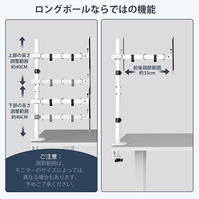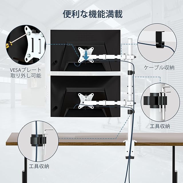 商品名:WORLDLIFT モニターアーム 縦 上下 2画面 デュアル ロングポール 水平可動 クランプ式 32インチ対応 耐荷重8KG 白 ホワイト