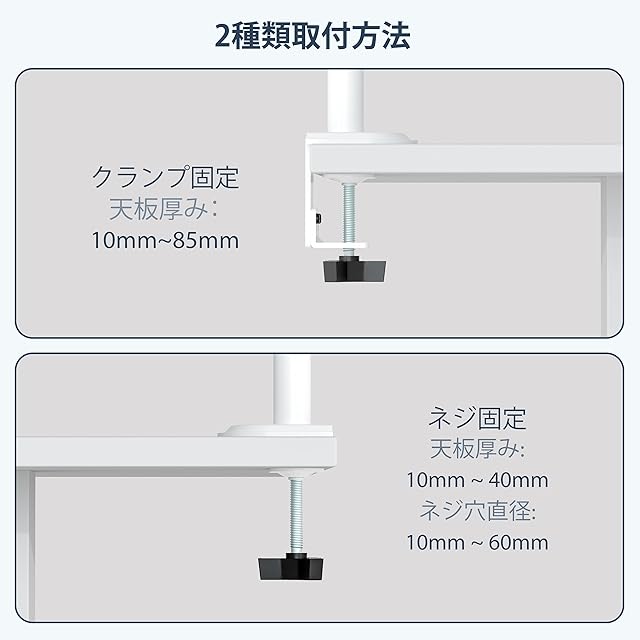 【固定方式】本製品はデスクにしっかりと挟み込むクランプ方式と、穴を利用してしっかりと挟むグロメット方式の、2つの固定方式に対応しています。天板厚さ:10~85mm 穴直径:10~60mm。