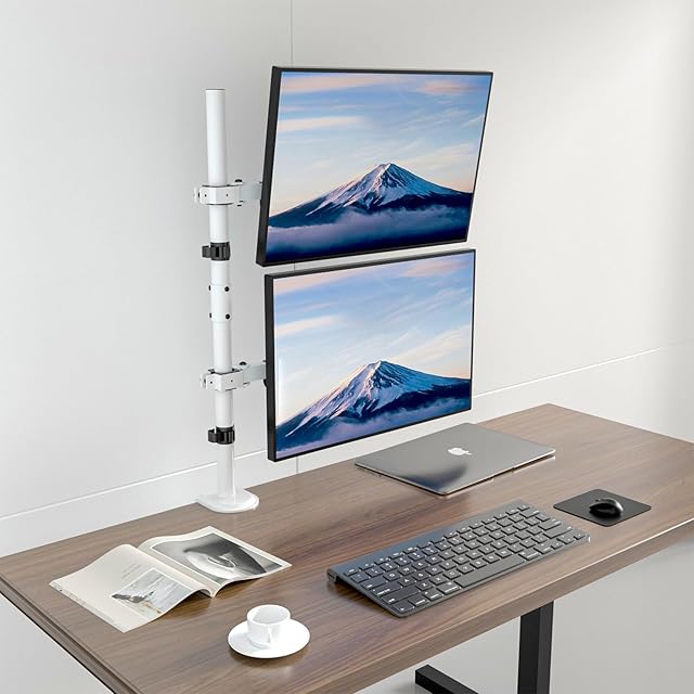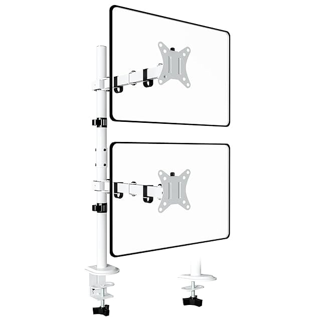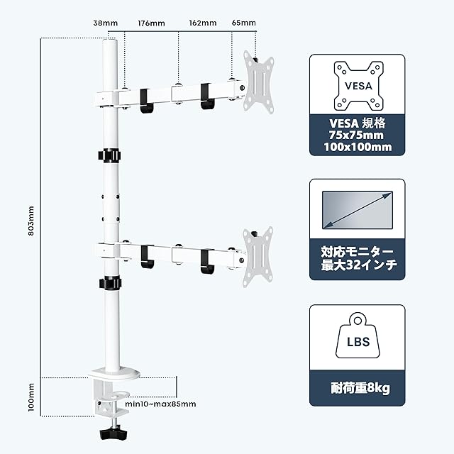 モニターアーム 縦 上下 2画面 デュアル ロングポール 水平可動 クランプ式 32インチ対応 耐荷重8KG 白 ホワイト