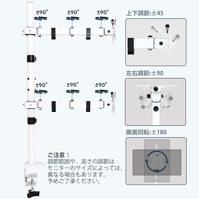 【角度調節】画面は上下方向に+45°ー-45°、左右方向に180°までの角度調整が可能です。さらに、モニター取付け部は360°回転可能なので、組み合わせもアレンジできます。ご注意:可動範囲内であっても、モニターのサイズによっては調整角度が変わることがあります。