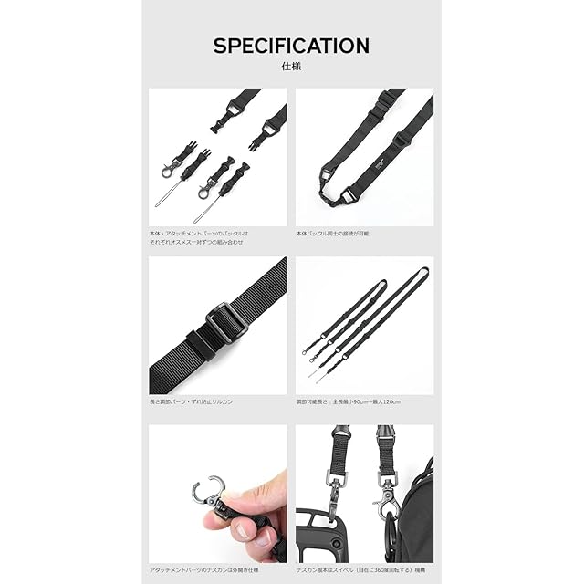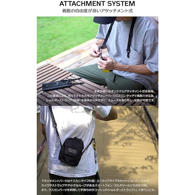 【ATTACHMENT SYSTEM】・・・ROOT CO.オリジナル仕様のアタッチメント式ネックストラップ。交互に取り付けたバックルの先端パーツを付け替えることにより、様々なアレンジが可能。ナスカンタイプとストラップタイプの先端パーツがセットになっています。
