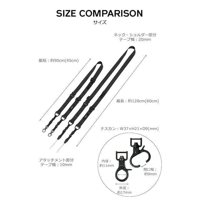 【LENGTH ADJUSTMENT】・・・長さ調整パーツでネックストラップタイプ、ショルダーストラップタイプの2パターンでの使用が可能。ウェビングが折り返し部分で浮いてしまわないよう、サルカンも付いています。