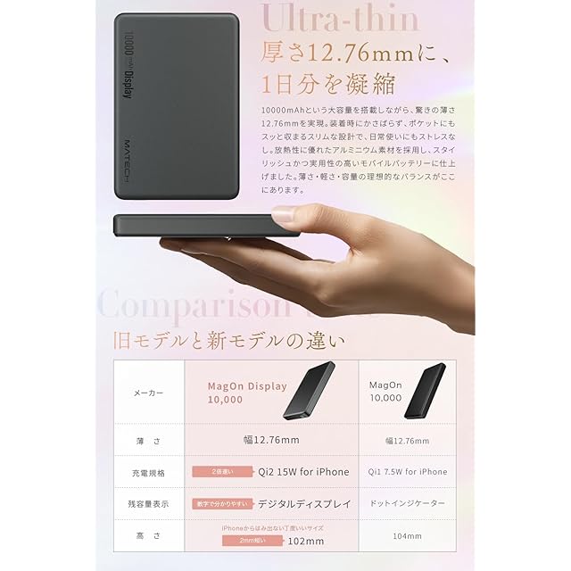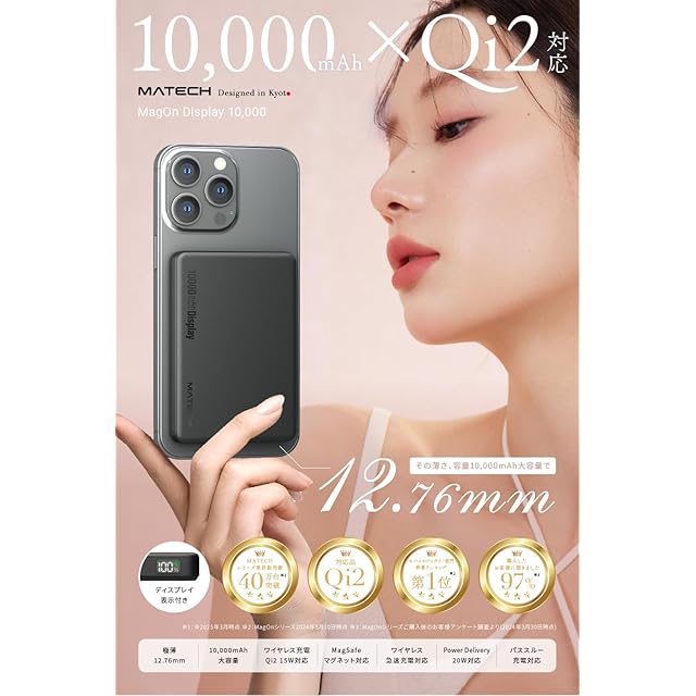 商品名:MATECH(マテック)® Qi2 モバイルバッテリー マグセーフ 10000mAh 薄型 小型 軽量【史上最薄12.76mm/アップグレード版 ディスプレイ付/MagSafe対応マグネット式/最大出力15W ワイヤレス/タイプC PD22W/iPhone12~16対応】 (MagOn Display 10000 Qi2 ブラック)