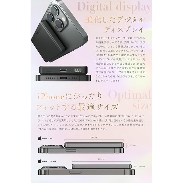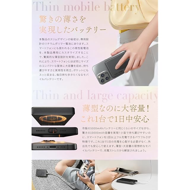 【薄くて大容量】一般的な5000mAh Magsafe対応モバイルバッテリーよりも、約15%を薄くなり、容量が2倍になりました。コンパクトな設計ながらお使いのiPhone 15 / 14 / 13 / 12シリーズへ約2回充電が可能です。