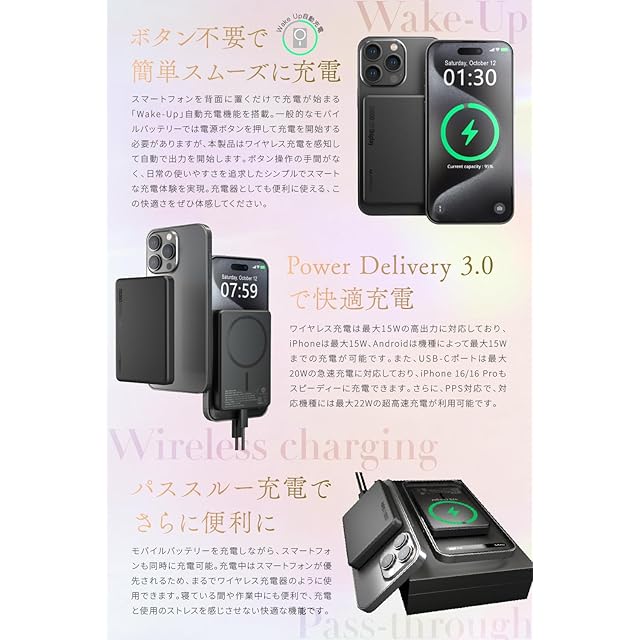 【ボタンを押さずに充電】 ワイヤレス充電対応のスマートフォンの背面を合わせるだけで。充電が始まる「Wake-Up」自動充電機能を搭載しています。通常は、充電を開始する場合、モバイルバッテリー側の電源を押す必要があり、ひと手間必要ですが、本製品はワイヤレス充電を検知して自動で出力開始できる「Wake-Up」機能により、スマートな充電が実現しました。充電器として使う場合にも非常に便利な機能となっています。