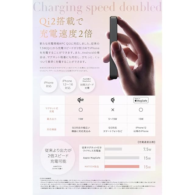 【Qi2搭載で充電速度2倍】新たな充電規格WPC Qi2に対応しました。従来の7.5W(Qi1)から充電スピードが2倍15WでiPhoneを充電することができます。また、Androidの場合は、マグネット吸着にも対応し、ぴたっと、くっついて素早く充電することができます。