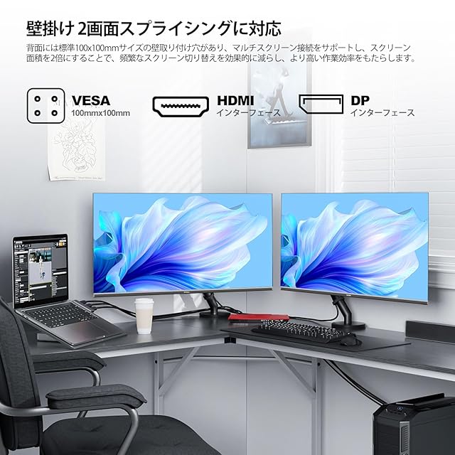 HDMI および DP ポートは、PC、Xbox、その他のタイプのゲーム機や周辺機器に適しており、さまざまなニーズに対応します。 機体の背面には100x100mmの壁掛け穴があり、壁掛けに対応し、異なる視覚体験を提供します。