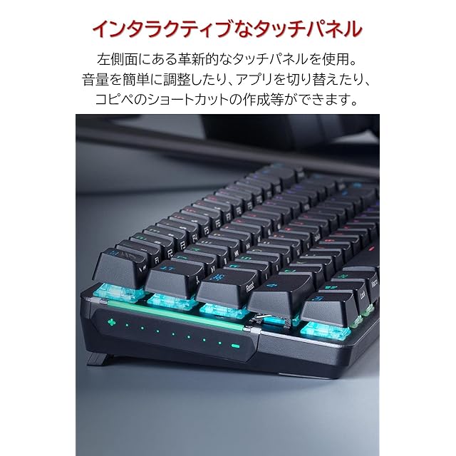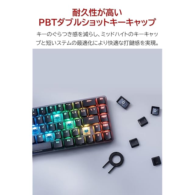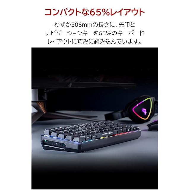 コンパクトな65%キーボード:矢印キーとすべてのファンクションキーを組み込みながら、キーキャップの長さを短くすることで、60%キーボードとほぼ同じサイズ感の30.6cm