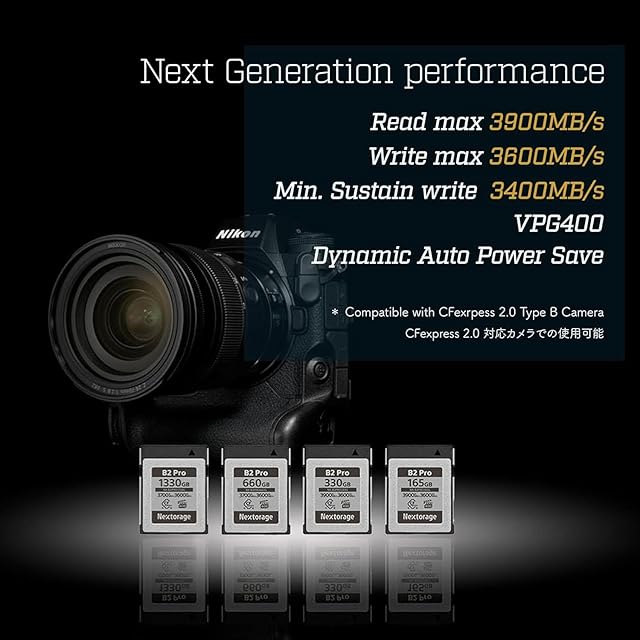 Nextorage CFexpress 4.0 Type B NX-B2PROシリーズは、今後ハイエンドカメラ市場でサポートされることが予想される次世代の規格対応のメモリーカードです。(※CFexpress 4.0非対応機器においてはCFexpress 2.0規格で転送します。現行のカメラでは従来のCFexpress 2.0規格と下位互換性があり、NX-B1PROシリーズと同等に安定した高画質動画撮影や高速連写撮影が可能です。) また、独自の低電力消費技術「Dynamic Auto Power Save (ダイナミック・オート・パワーセーブ)」 を搭載し、動画撮影時の消費電力を低減。カメラのバッテリー消費を抑えます。さらに、転送速度の高速化に伴うカードの温度上昇を抑え、サーマルスロットリング*の発生を抑制。安定した転送速度を維持できるのもNX-B2PROの特長です。 この高速で安定した読み出し/書き込み性能により、8K動画やRAW画質での高速連写撮影などにも対応。VPG400をサポートしているため、VPG400に対応したCanon EOS R3/EOS R5/EOS R5Cとご一緒にお使いいただく際、安心して8K動画撮影を行っていただけます。