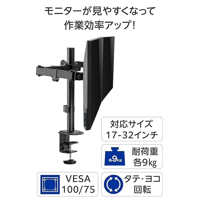 商品名:グリーンハウス デュアルモニターアーム 横並び2画面 17~32インチ対応、耐荷重~9kg 4軸 3年 GH-AMDN2H-BK
