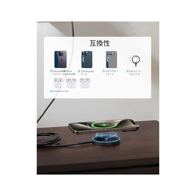 【瞬時充電】: iPhone16/15/14/13/12シリーズとAirPods 4 with Active Noise Cancellation専用。ワンタッチ充電のMagSafe対応ワイヤレス充電。