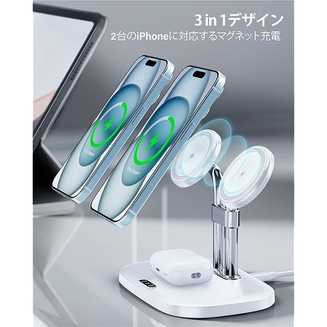商品名:iPhone 16 15に対応ワイヤレス充電器、SwanScout 706M、デュアル mag-safe 充電器 iPhone 16/15/14/13/12シリーズ対応、AirPods 4/Pro 2/Pro/3対応 (ホワイト)