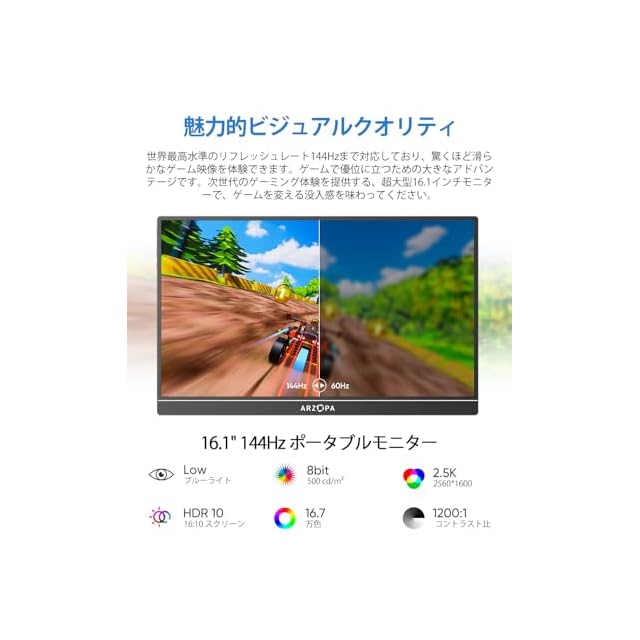 ARZOPAモバイルモニター 144Hz 16.1ゲームモニター FHD IPS液晶パネル 72%色域 非光沢 軽量ディスプレイ 標準HD/USB/Type-C/mini HDMI端子 PS4/PS5/XBOX/Switch/PC/Macなど対応 PSE認証済み 自立型