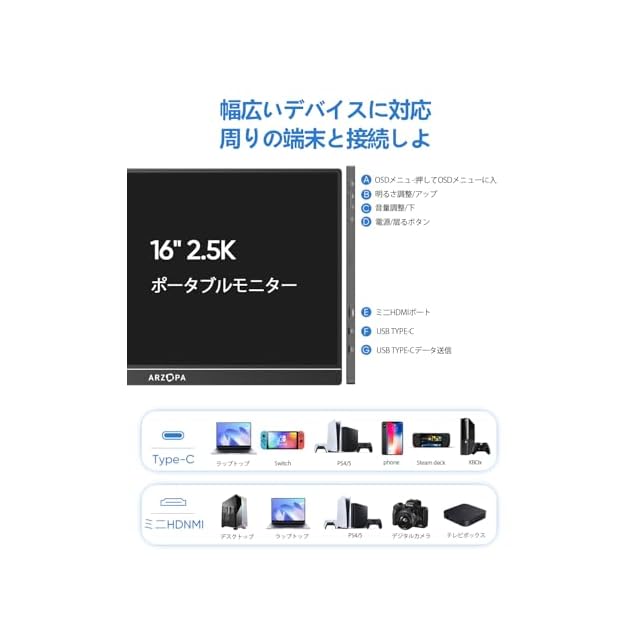 【多機種に対応】 ARZOPAモバイルモニターは、豊富な入力端子を備えており、ノートパソコン、デスクトップ、スマホ、Switch、 PS4、PS5、ズベリーバイ、Xbox One、またはWiなどに対応しています。 (ご注意: ①音量調整ができない場合は再起動してみてください。 @バッテリーは内蔵されていないため、Switchに接続する際はSwitchのオリジナル電源アダプターを使用してモニターに給電する必要があります。)ゲームをプレイ中にXboxおよびPSゲーム機に接続すると黒い画面が表示される問題の解決方法:1. Xboxに接続し、可変リフレッシュレート(VRR)機能をオフにします。設定 - 一般 - テレビとディスプレイのオプション>ピデオモード - 可変リフレッシュレートをオフにしてください。2. PS5に接続し、VRR機能をオフにします。設定 - 画面とビデオ - ビデオ出カVRRをオフにしてください。また、製品の電源にも注意が必要で、アダプターには15WI以上の電力が必要です。