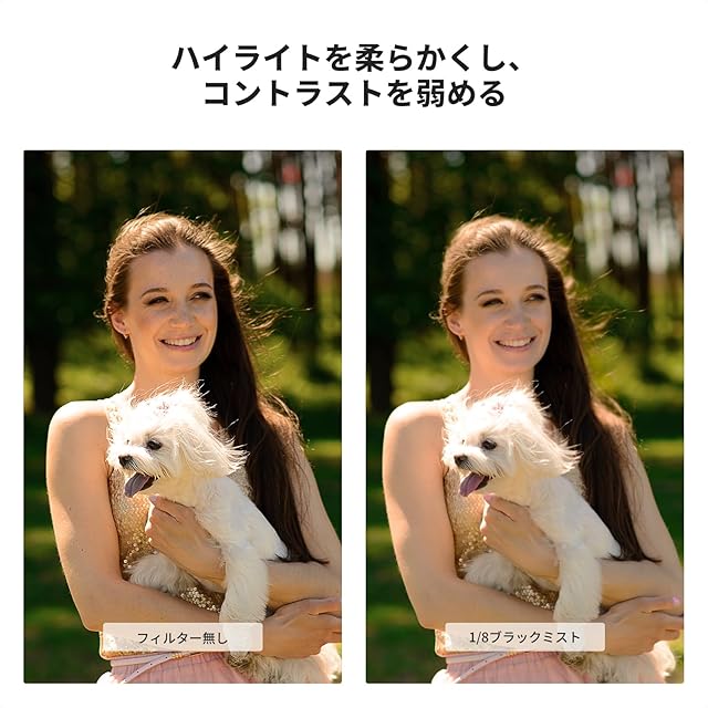 【ソフト効果&コントラスト抑え】77mm ブラックミスト1/8フィルターは人物向けで肌を滑らかにし、光源をやわらかくする効果があり、夜景の光や逆光、木漏れ日などの点光源もフワッと幻想的な雰囲気に仕上げてくれる。ハイライトとシャドウのコントラストを抑え、柔らかく表現してくれる写真や動画に最適。※外装の新旧が混在しますが、中身は同一です。