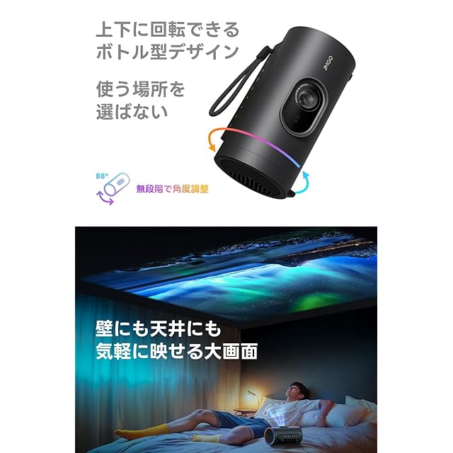 【回転できるボトル型デザイン&壁に張り付くシームレス補正】上下に88度回転することができるボトル型なので、角度調整のためにわざわざ下に物を敷いたり、別売りのスタンドを用意したりする必要がありません。さらに動かすたびに映像を遮らずにリアルタイムで歪みを補正するシームレスな台形補正・オートフォーカス機能を備えているので、パッと取り出してポンと置くだけで好きな場所に気軽に投影することができます。