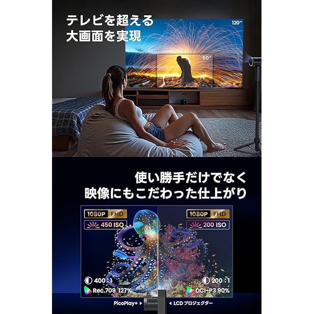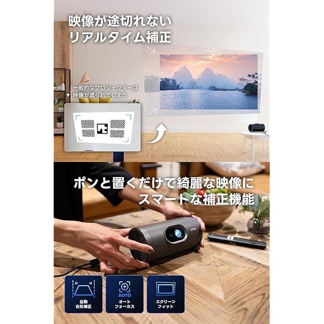 【わずか約0.74kgで気軽に使えるコンパクトさ】縦投影やシームレス補正という次世代技術を搭載しながら、約0.74kgという驚異的な軽さ・コンパクトさを実現。女性でも片手で軽々と持ち運ぶことができるので、普段はリビングでテレビ代わりに使いながら、キッチンで料理をしながら動画をみたり、寝室で天井に投影してお子さんを寝かしつけたりなど様々な場面でご利用いただくことができます。