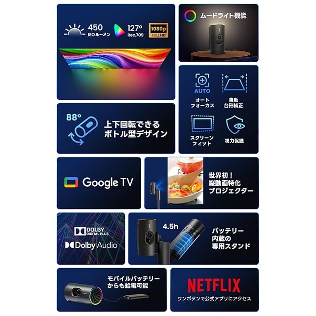 商品名:JMGO PicoPlay+ 縦投影可能コンパクトプロジェクター 【Google TV搭載/Netflix公式APP使用可/450ISOルーメン/回転できるボトル型/オートフォーカス/リアルタイム補正/全自動台形補正/小型 /8Wスピーカー/家庭用/低遅延/天井/静音】
