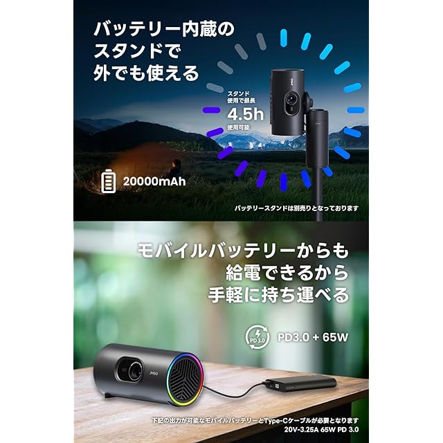【別売大容量バッテリースタンドからも給電可能!キャンプでも大活躍】20000mAhの大容量バッテリーを内蔵しているスタンドを使用すれば、コード無しで最長4.5時間(※ECOモード時)と映画2本分の映像を楽しむことができます。コードレスで使用できるので、お子さんやペットが足を引っかけたり、お部屋の景観を乱したりすることがありません。Type-Cケーブルで給電ができるので、モバイルバッテリーによる給電も可能。出力:20V-3.25A 65W PD 3.0)