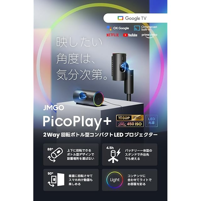 JMGO PicoPlay+ 縦投影可能コンパクトプロジェクター 【Google TV搭載/Netflix公式APP使用可/450ISOルーメン/回転できるボトル型/オートフォーカス/リアルタイム補正/全自動台形補正/小型 /8Wスピーカー/家庭用/低遅延/天井/静音】