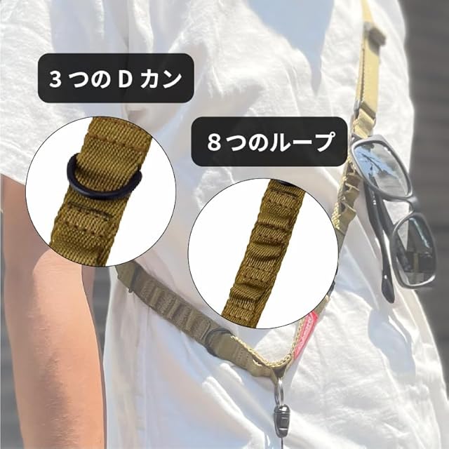 【身の回りの物をまとめて掛けて手ぶらでお出かけ】ストラップ本体に付いている3個のDリングとカラビナフックが通せる8ヶ所のループに小物、アクセサリーを掛けてバッグを持たずに出かけられます。スマートフォン、鍵、眼鏡、サングラス、小銭入れなどがまとめて身に付けられ、旅行やアウトドア先での散策や近所の散歩にも手ぶらで出られます。ワンタッチで着脱できる松葉ストラップが付属。