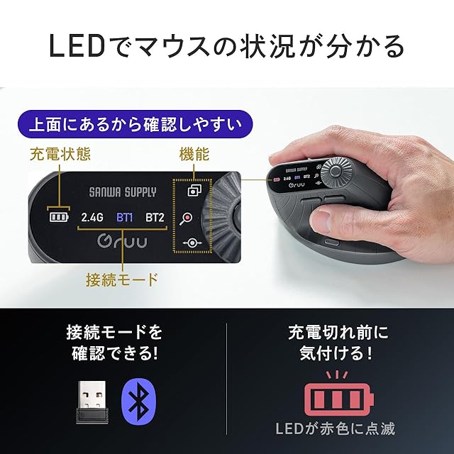 マウスのLED表示で、 充電 状態、接続モード、選択している機能の3つの状態が確認できます。充電切れ前に気づくことができて便利です。また、 エルゴ マウスを動かしている間は、選択した機能がLED点灯します。