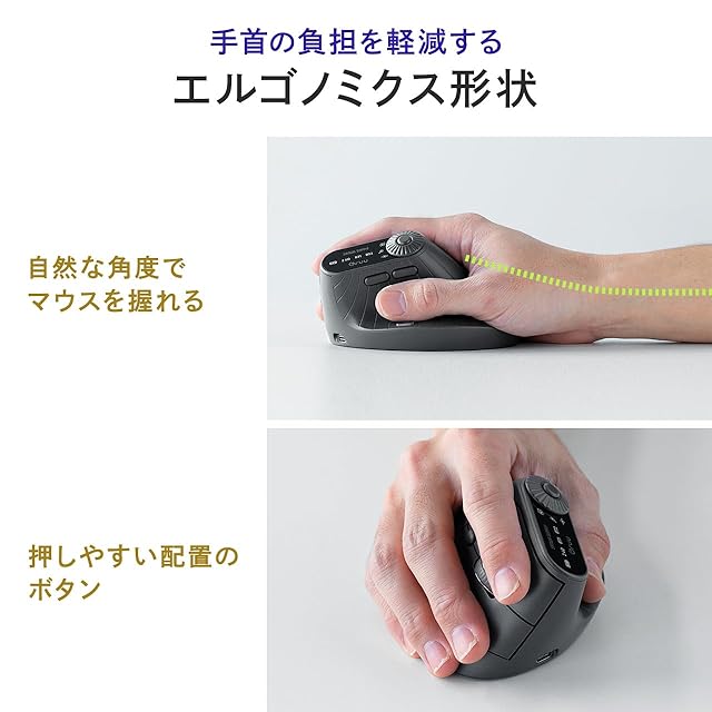縦持ち の自然な角度でマウスを握り、手首の負担を軽減するエルゴノミクス形状です。
