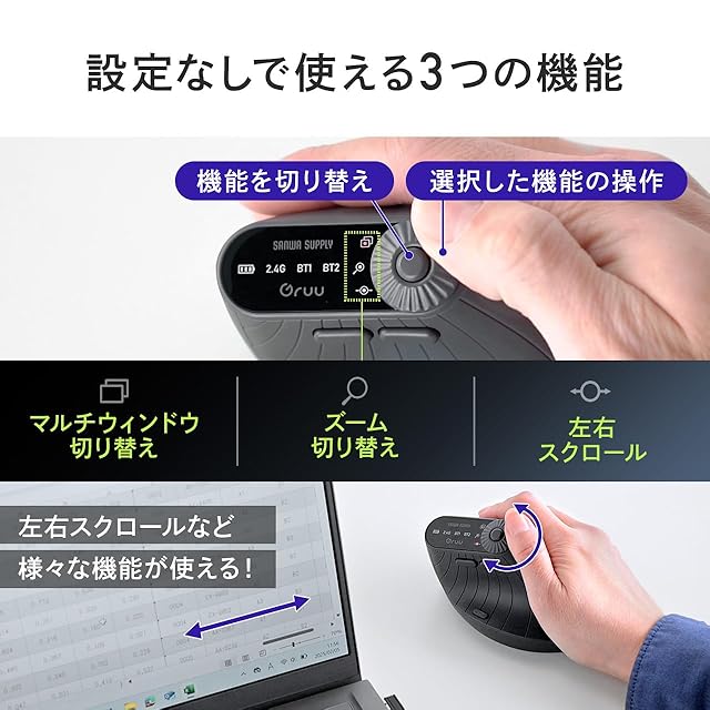 ダイヤルで3つの機能を操作できる、 多機能 エルゴノミクス マウスです。通常のマウスの機能に加えて、 左右スクロール 、ズーム操作、マルチウインドウ切替えがダイヤルを回すことで操作できます。