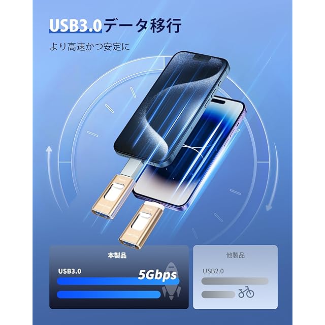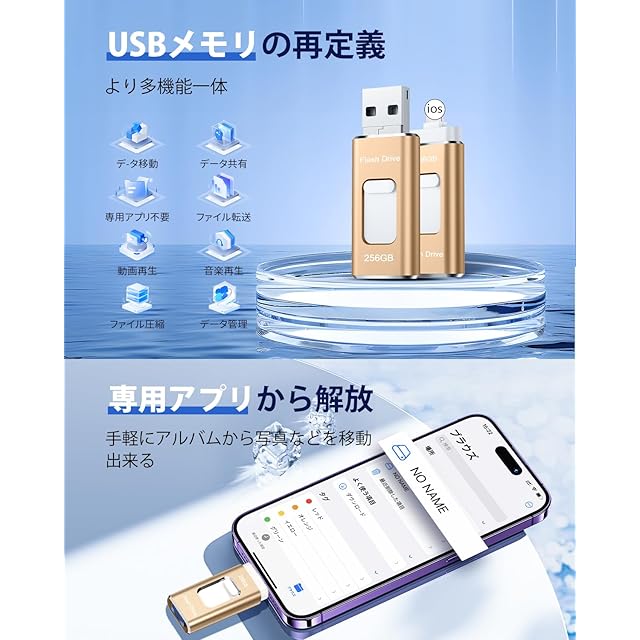 商品名:【専用アプリ不要 アルバム整理簡単】Phone用USBメモリ 4in1 USBメモリ256GB phone用外付けメモリ 高速USB3.0 タイプc usbメモリー IOS/Android/PC/Macに対応 phone兼用 バックアップ アプリ不要 スマホ usbメモリ phone 写真データ保存 スマホ容量不足解消 写真画像撮り放題(ゴールド)