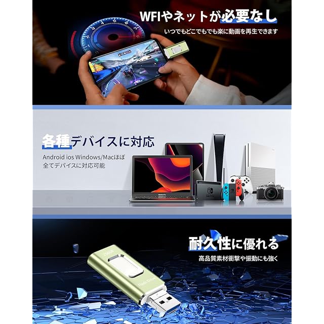 【一本四役・高速データ転送】iPhone用USBメモリはiOS、Type-C、USB、Micro USBの四つのコネクタを搭載でこの一本で全てのIOS、Windows PC、Typec、Micro USBのAndroid設備にスライドで対応しています。デバイスごとに対応した製品を複数購入する問題を解決します。各機種の間に写真やビデオなどのファイルを自由に共有できます。高品質なチップを採用しており、安定性が飛躍的に向上され、高速なデータ伝送を実現します。ネット環境がなくても気になる大量に溜まっている写真や動画データを簡単にバックアップできるので、端末の容量不足も解消できます!Phone写真バックアップにより、高額なクラウド サービスの月額料金を節約するのに役立ちます。