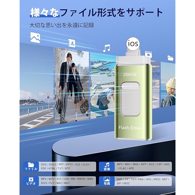 商品名:【専用アプリ不要 アルバム整理簡単】Phone用USBメモリ 4in1 USBメモリ256GB phone用外付けメモリ 高速USB3.0 タイプc usbメモリー IOS/Android/PC/Macに対応 phone兼用 バックアップ アプリ不要 スマホ usbメモリ phone 写真データ保存 スマホ容量不足解消 写真画像撮り放題(ライトグリーン)