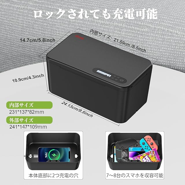 【大容量禁欲ボックス&12ヶ月期間】 内部サイズ231*137*82mm 、7~8台スマホ(スマホの厚さに応じて)、8.5インチ以下のタブレット、2台8インチ以下のi-Pad Mini(ケース付けない)、4~5個ゲームコントローラ(サイズに応じて)を収納可能です。パッケージ内容: 携帯ロック箱1個、Typc-Cケーブル1個、取扱説明書1個、カスタマー・サービスカード1個