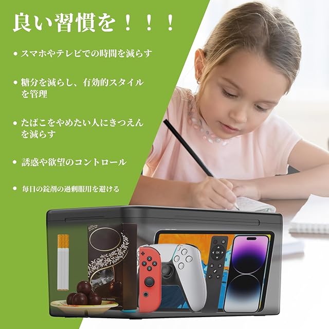 【欲望コントロール】 スマートフォンロックケースは子供がゲームばかりして勉強してくれない、ついついスマホを触ってしまい、仕事に集中できない、誘惑を取り除き、携帯やゲーム中毒、禁欲したい人に最適です。スマートフォン、mini pad、お金、クレジットカード、小型おもちゃ、タバコ、テレビのリモコン、マウス、小型ゲーム機、ゲームコントローラ、お菓子・おやつなどをこのタイミングロックボックスにロックされで、様々な依存症という現代病を防ぐことができ、良い習慣を構築する。