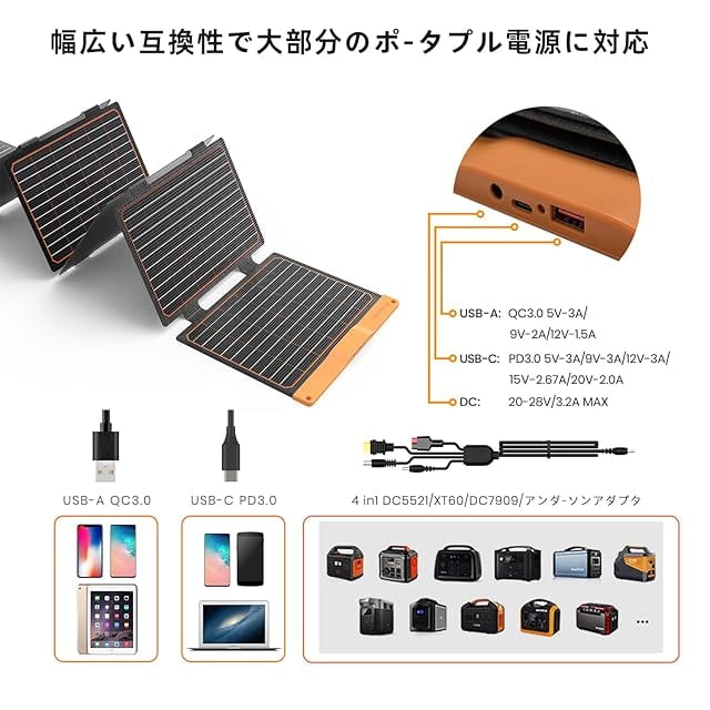 【デュアルUSB DCポート内蔵】QC 3.0 Max 18 W USB-A、PD 3.0 Max 40 W USB-C、Max 60 W DC(20 V-28 V)出力ポートを備え、中小型太陽光発電機(300 Wh未満)、電池パック、パソコン、iPad、携帯電話(アンドロイドとアップル)などの日常的な電子機器を直接接続して充電することができる。各ポートの最大電圧と電流に注意してください。