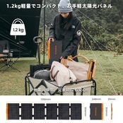 【軽量・コンパクトポータブル電源 ソーラーパネル セット】重さ1.2kgの軽さ、折り畳めばタブレットサイズに、収納時サイズ:252×300×30mm、展開時サイズ:1020×300×18.5mm。それほど重くはありませんが、トレッキングには少し負担がかかり、キャンプやドライブ旅行、家庭用非常用電源に適しています。注意:スタンドがありません。