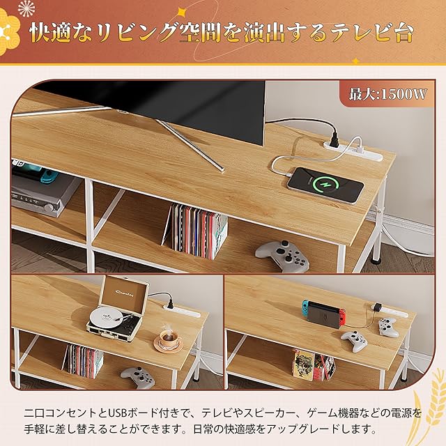 コンセントとUSBボード付き:天板には、ほこりの侵入を防ぐ2口コンセントx1とUSBボードx1が備えており、テレビやゲーム機器の利用に最適です。日常の快適さを、ほんの少しでも向上させます。
