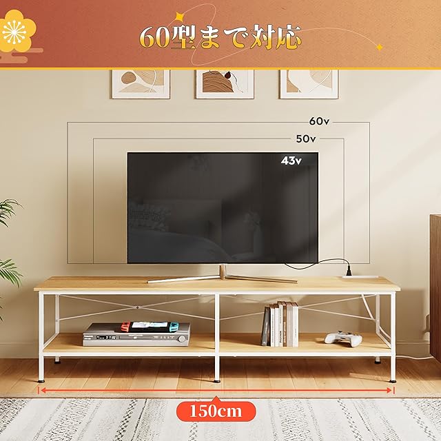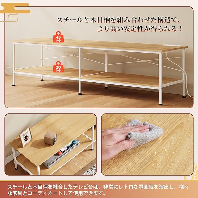 ヴィンテージ調のテレビ台:レトロな風格を誇るスチールと木を組み合わせたテレビ台は、現代のインテリアにピッタリとマッチするファッションアイテムです。150cmの幅サイズにより、最大60インチのテレビに対応可能で、リビングの中心に存在感を放ちます。