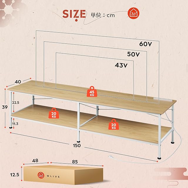 商品仕様:商品外寸:幅150×奥行40×高さ39cm/本体重量:13.4kg 梱包重量:15kg /対応テレビ:32-60型対応/耐荷重:天板-45kg 、二段棚-20kg/ボード厚さ:15mm/型番:ADSG621/素材:プリント紙化粧繊維板/ブランド:WLIVE ※こちらの製品には日本語の取扱説明書と組み立て用道具などを揃いますので、女子でも楽に組み立てられます。(電動ドライバーがあると、組立に役立ちます。)
