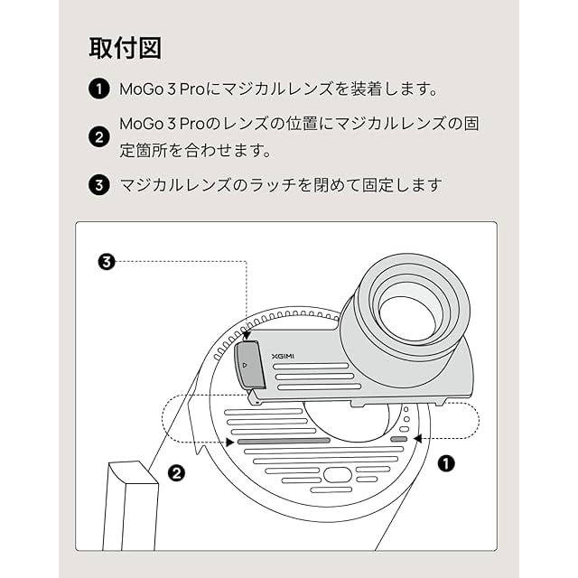 取付図:本体のレンズの横にXGIMIマジカルレンズの端をはめ、マジカルレンズの底面を本体の溝に合わせた後、ラッチを本体にはめて固定してください。