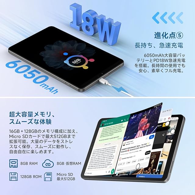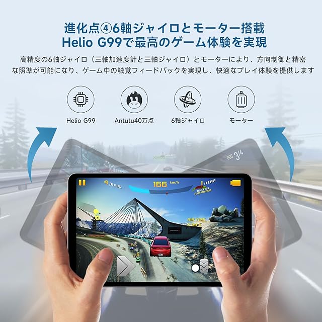 iPlay60 Mini Pro 8.4インチAndroidタブレット iPlay60 Mini Proは、先進的なAndroid 14をベースにしたALLDOCUBE OS 3.0を搭載した8.4インチのタブレットです。デュアルスピーカーによる臨場感溢れるサウンドと、顔認証対応のセキュリティ機能を備えています。6050mAhの大容量バッテリーとPD18Wの急速充電に対応しており、長時間の使用も安心です。さらに、ジャイロスコープ、モーター、重力センサー、光センサーなどの多彩なセンサー機能を搭載しています。 ディスプレイは解像度1200x1920、輝度350nitの8.4インチで、美しい映像を楽しめます。G99チップを搭載し、AnTuTuベンチマークで40万点のパフォーマンスを発揮します。16GBのRAMと128GBのROMを備え、最大512GBまで拡張可能なので、存分にコンテンツを保存できます。GPS、Beidou、Glonass、Galileoなど多様なナビゲーションシステムにも対応しており、正確な位置情報を提供します。 サイズは202.7 x 126 x 7.9 mm、重量は310gと軽量コンパクトで、持ち運びも便利です。2.4GHzおよび5GHzのWiFiとBluetooth 5.2をサポートし、安定した接続環境を提供します。さらに4G LTEにも対応しているため、外出先でも快適にインターネットを利用できます。iPlay60 Mini Proは、その強力なパフォーマンスと多彩な機能により、エンターテイメント、学習、仕事など、あらゆるシーンでの使用に最適なタブレットです。
