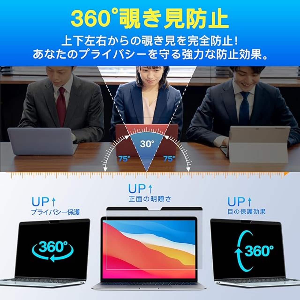 【360度全方位覗き見防止】360度方向からの覗き見を防ぐ、特別設計のプライバシーフィルターです。正面からはクリアに見えますが、周囲からは画面が真っ暗に見え、どの角度からでも情報漏洩を防ぎます。