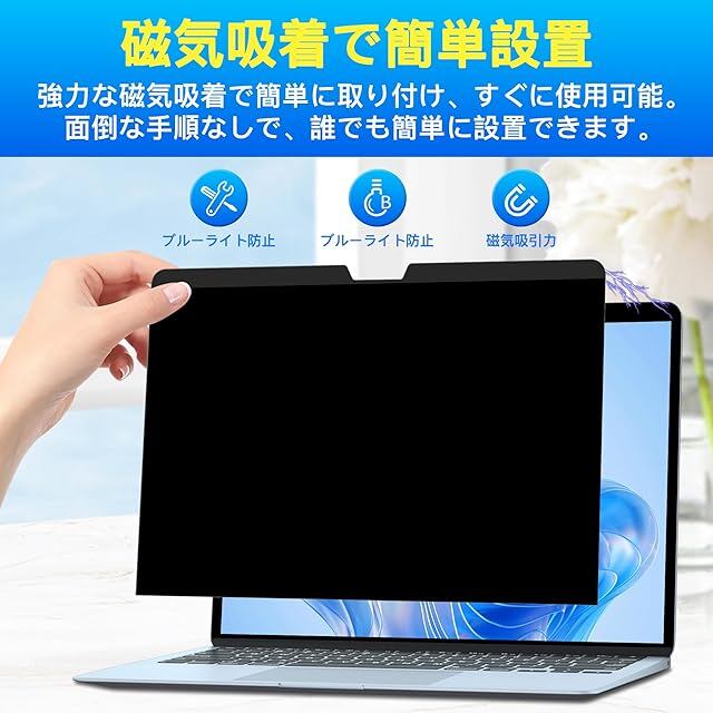 【マグネット式で簡単に取り付け・取り外し】わずか数秒で取り付け・取り外しができるマグネット式設計。使用シーンに応じて、簡単にフィルターを着脱し、プライバシーを守ることができます。