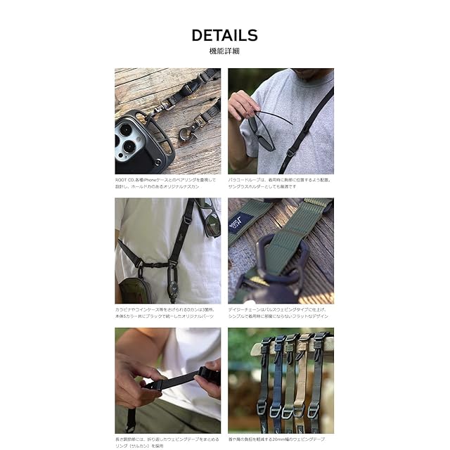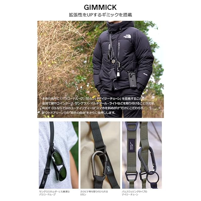 【LOOP and DAISY CHAIN】・・・パラコードループとDカンを使用して、様々なアウトドアギアの吊り下げが可能。パラコードループは、サングラス等を吊るしても傷つきにくく、強度も安心。DカンもROOT CO.オリジナル仕様で、MAG REELやTRIAD CARABINERとの相性も抜群です。また本体根元部分のデイジーチェーンはフラットタイプ仕様に。パルスウェビングのような見た目で、見た目も機能も充実。もちろんギアの吊り下げも可能です。
