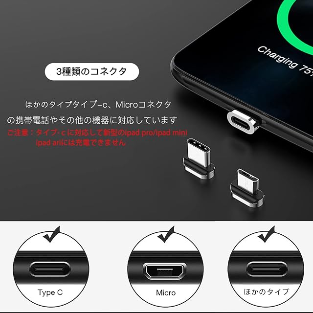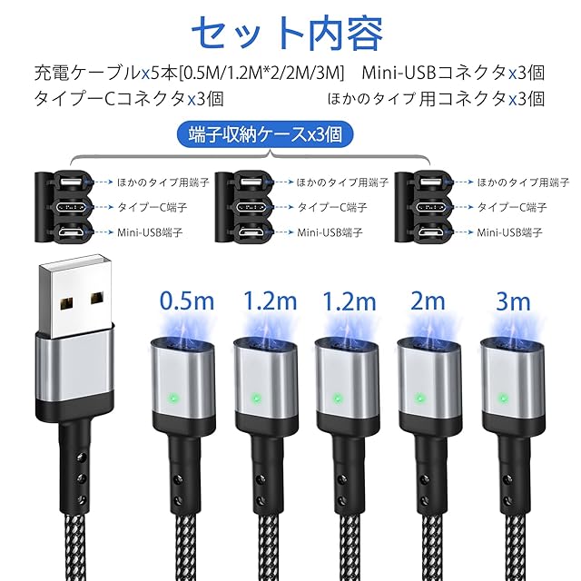 商品名:マグネット 充電ケーブル SUNTAIHO USBケーブル【0.5M 1.2M 1.2M 2M 3M】QC3.0/3A急速充電 USB2.0高速データ転送 磁石 磁気 防塵 着脱式 マイクロUSB Type-C コネクタ タイプc Micro USB Cable LEDインジケーター付き 磁気端子収納ケース付き - SYCX001 (5本セット&9個マグネット端子)