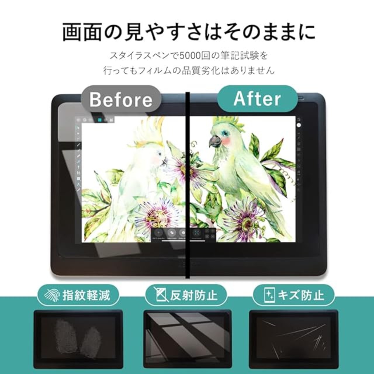 【耐久性】:耐擦傷性試験にて、500gのスタイラスペンで5000回の筆記試験を行っても品質の劣化は認められませんでした。 【反射低減】:フィルムは光の反射を抑えるアンチグレア(ノングレア)の特性があります。※透明感を求めるユーザーには向きません。